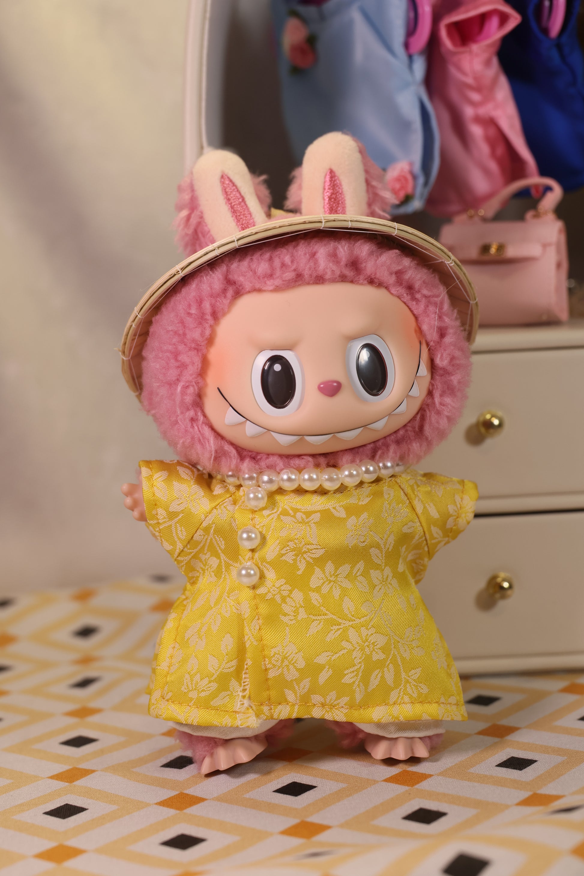 Wrap your 17cm Labubu in the warmth of tradition with our Golden Sun Brocade Miniature Áo Dài Set—a radiant homage to Vietnamese heritage, elegance, and strength. This handcrafted collectible doll outfit glows with the energy of sunshine and celebration, drawing inspiration from the golden áo dài often worn during festive occasions and Tết (Vietnamese Lunar New Year).